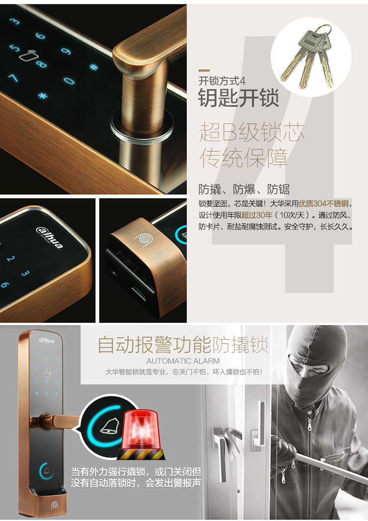 产品功能非常不错,用了一段时间,感觉真的是科技改变生活,轻松无负担,以前总是觉得门没有关,反复拉拽,现在再也不会有忘记关门的强迫症 用料做工:感觉是全铜的,里外锁十几斤重,显得很耐用; 商品品质:品质很好,方便 解锁速度快 外观材质:非常好看,颜值很高 ,另外要说的是安装师傅的手艺特别好,给我安装、操作到位才走,服务环环相扣,交易过程很愉快